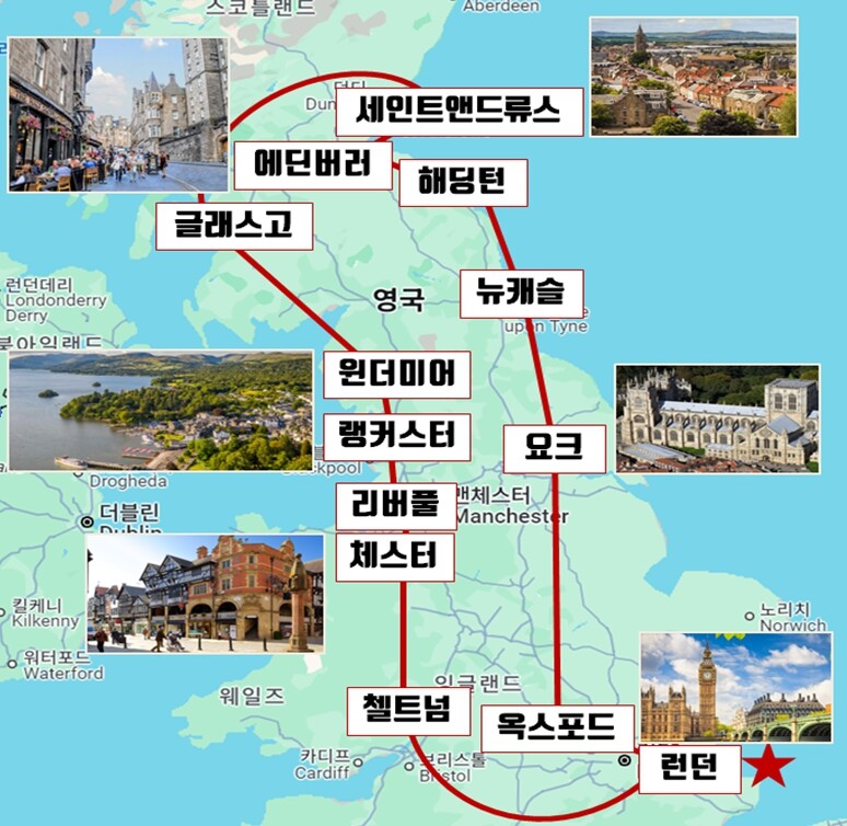 런던/옥스포드/요크/뉴캐슬/해딩턴/에딘버러/세인트앤드류스/글래스고/윈더미어/랭커스터/리버풀/체스터/